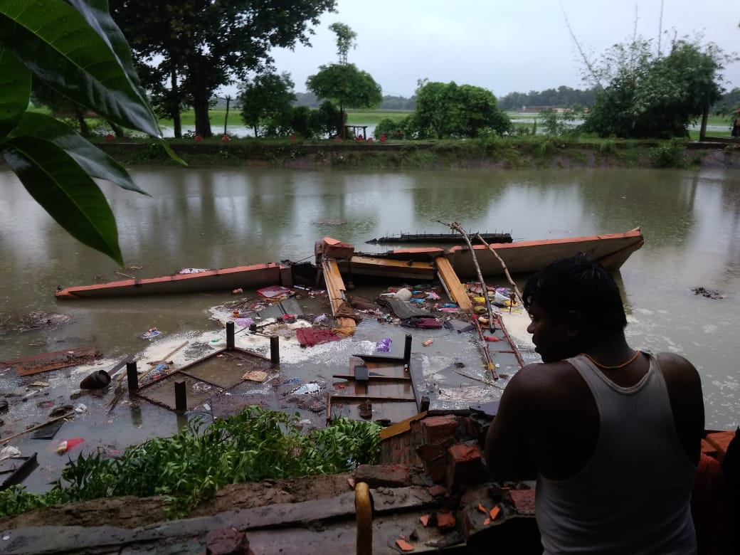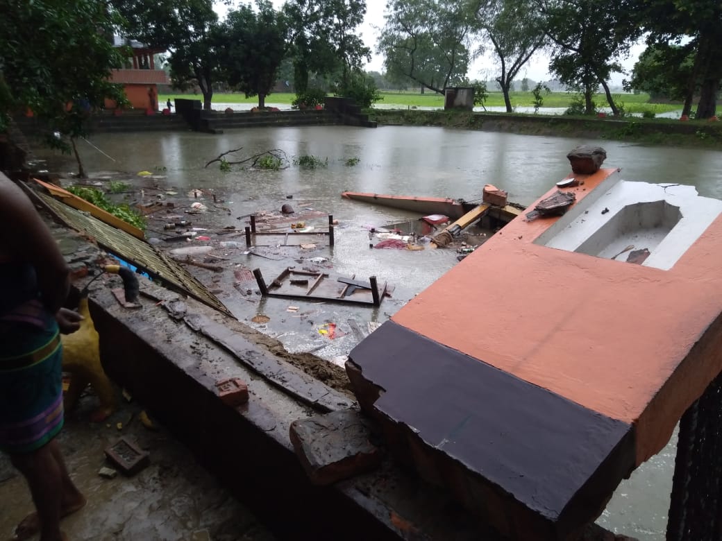 खानपुर निवासी रणजीत दास (70) व साध्वी यशोदा देवी (65) दुर्गा मन्दिर में ही रहकर हमेशा पूजा पाठ करते थे। मंगलवार को भी सुबह पूजा पाठ करके मन्दिर में बैठकर भजन कीर्तन कर रहे थे। इसी बीच, तेज आंधी के साथ बरसात शुरु हो गयी और मन्दिर टूट कर पोखरे में समा गया। मन्दिर के साथ साधु और साध्वी भी पोखरे के गहरे पानी में चले गये।जिस प्रकार मंदिर पोखरे में गिरा है, उसे देख लोगों का दिल दहल जा रहा है। संयोग अच्छा था कि घटना स्थल से कुछ दूरी पर ही दसकर्म कार्यक्रम चल रहा था। वहां मौजूद लोगों ने पोखरे में डूब रहे साधु और साध्वी को किसी तरह से बाहर निकाला। दोनों को इलाज के लिए सहतवार अस्पताल ले जाया गया, जहां से चिकित्सकों ने जिला अस्पताल रेफर कर दिया।